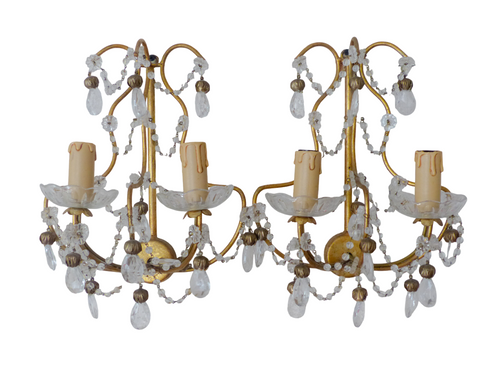Gorgeous PAIR Antique Wall Light Sconces glass Drops Gilded Metal Italy 1940's