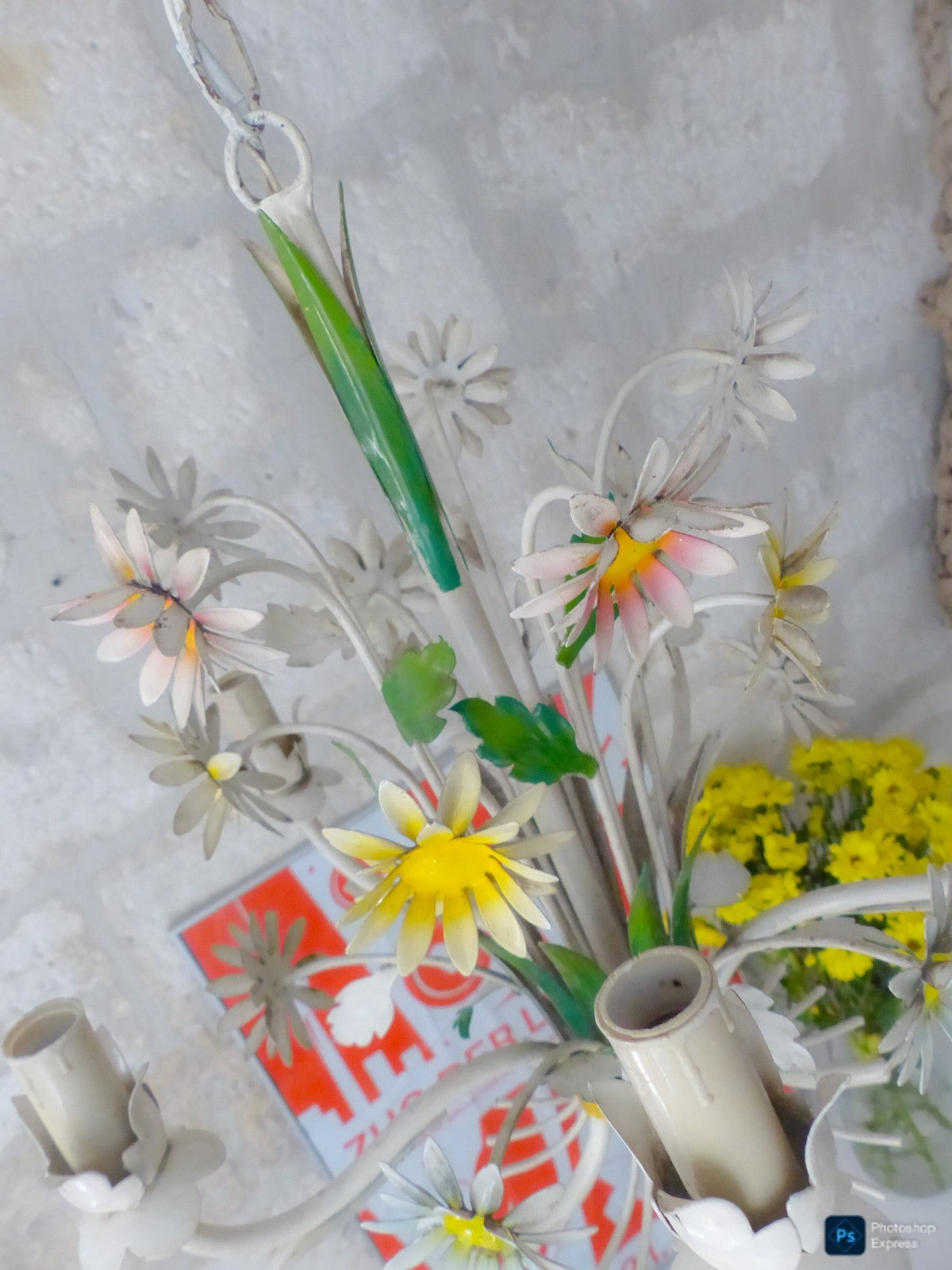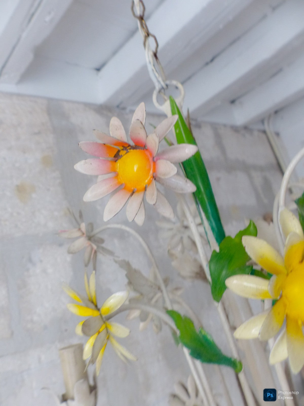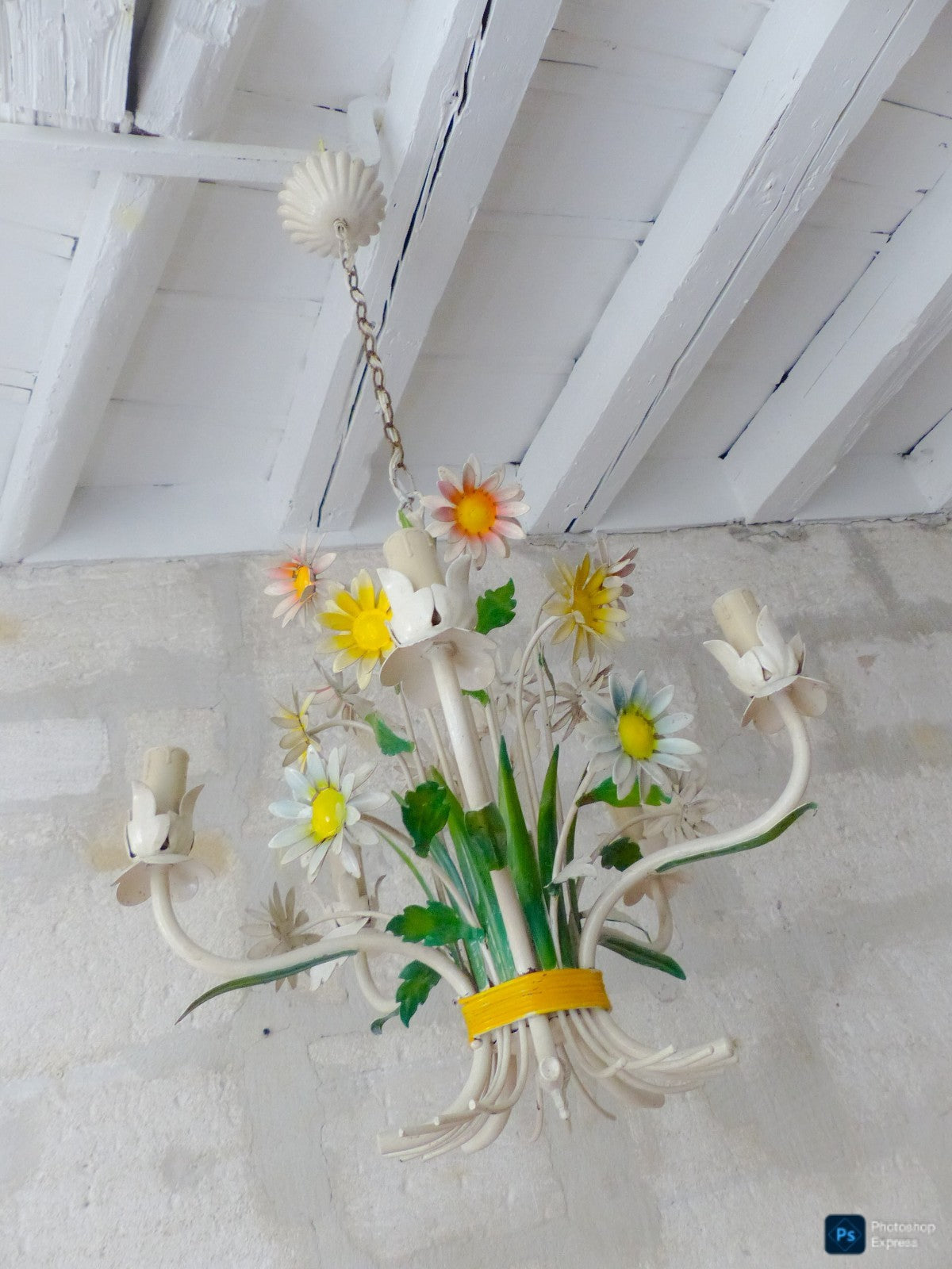 Enameld metal & tole flowers which makes it a very special chandelier,