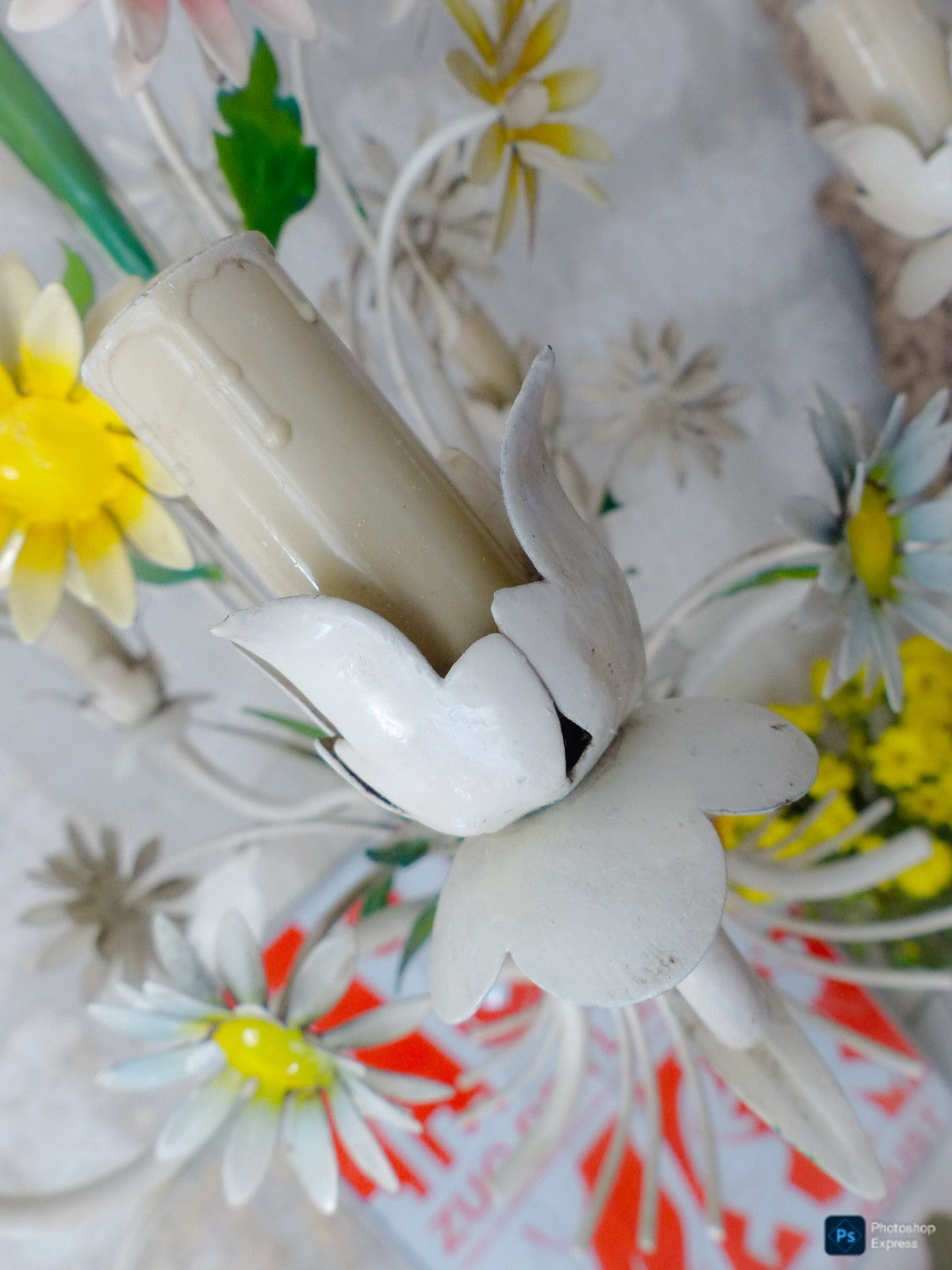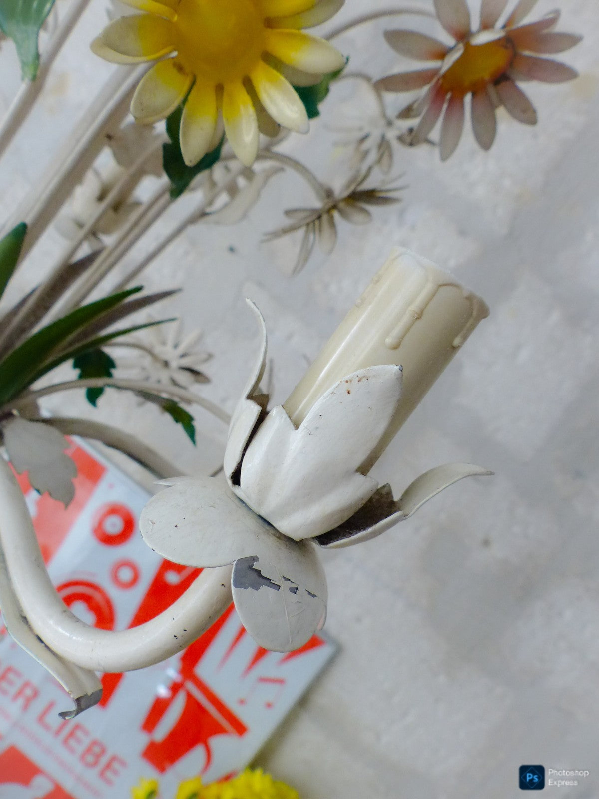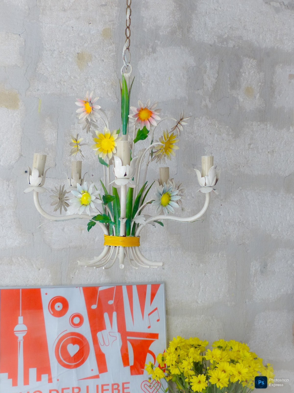 Enameld metal & tole flowers which makes it a very special chandelier,