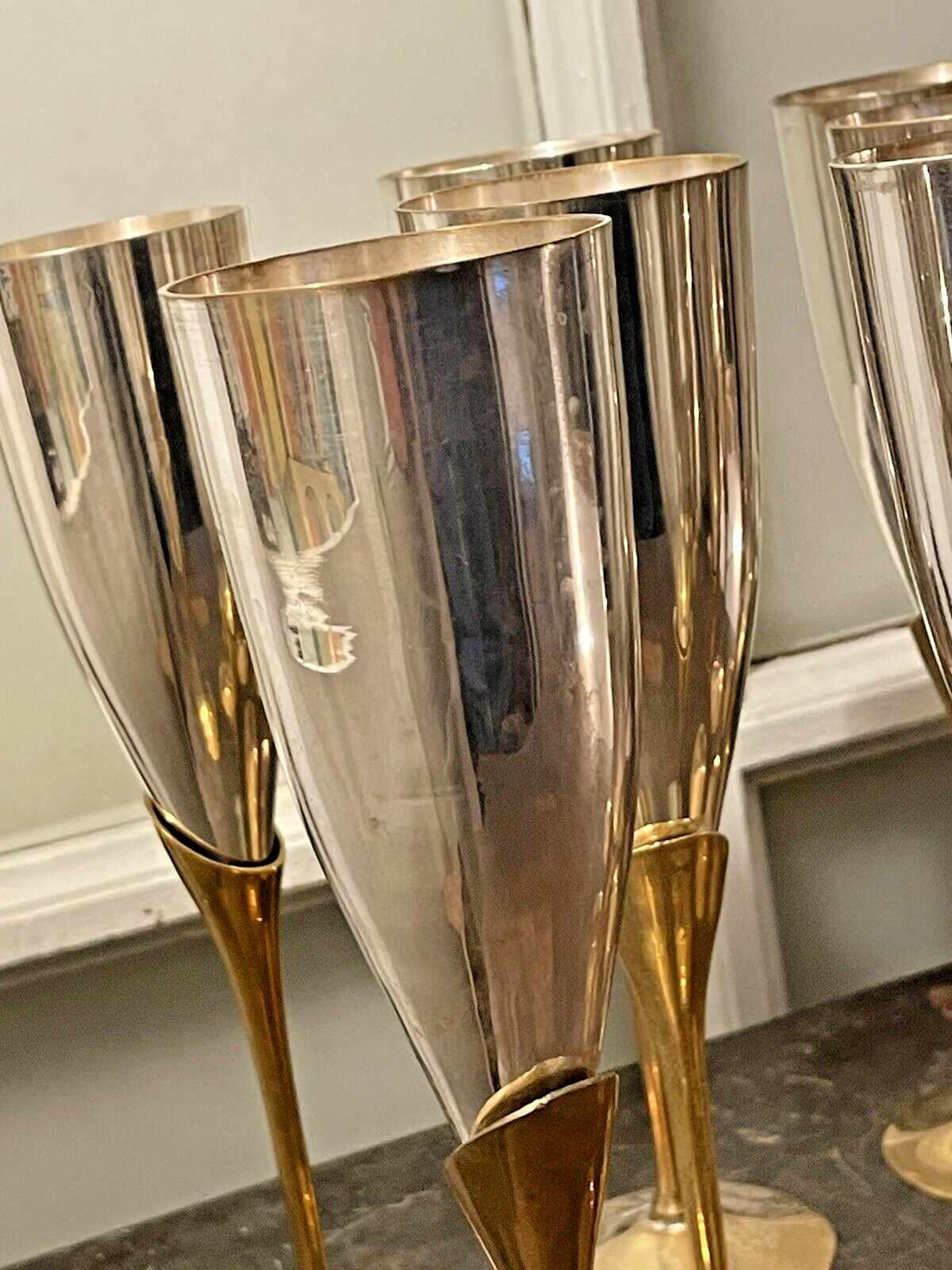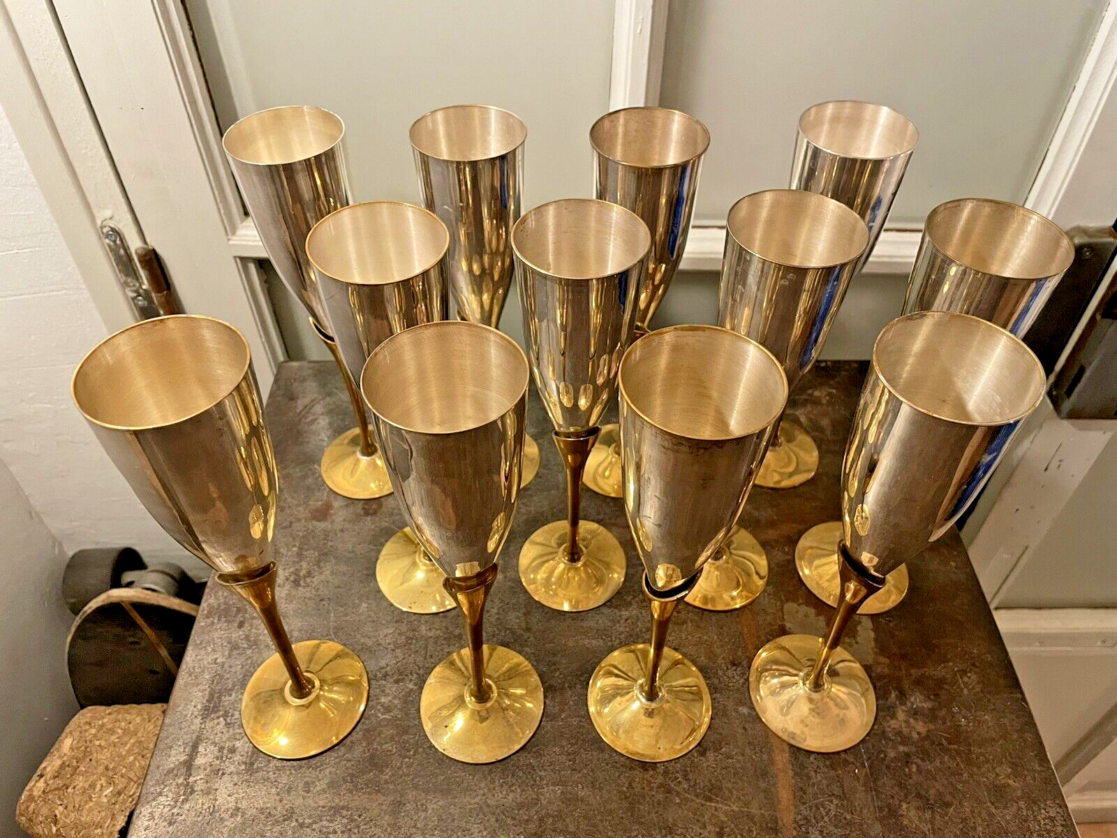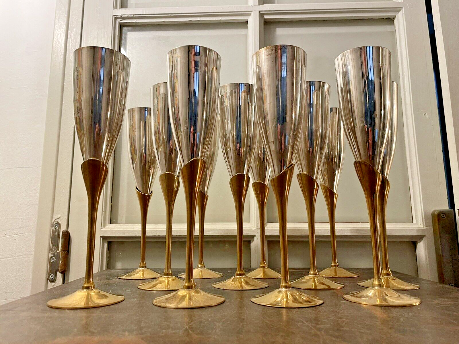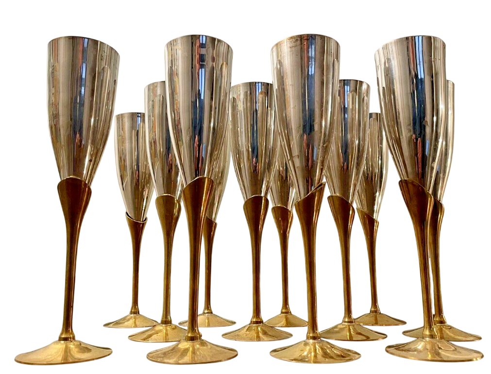 Enhance your barware collection with this charming set of 12x vintage champagne flutes. The flutes are crafted from brass and gilded metal, and feature a silver plated finish. These unique flutes are a perfect addition to any collector's barware collection. The set is not only functional, but also serves as a beautiful display piece. Don't miss out on the opportunity to own this stunning set of vintage champagne flutes! The elegant flute sits in a stem with an assymetric neck. The cups not only add a luxurious touch but also help keep the champagne chilled longer, making them as functional as they are stylish.