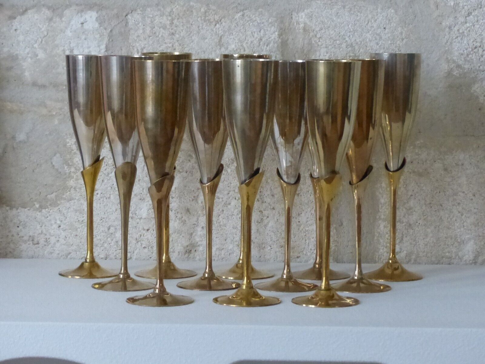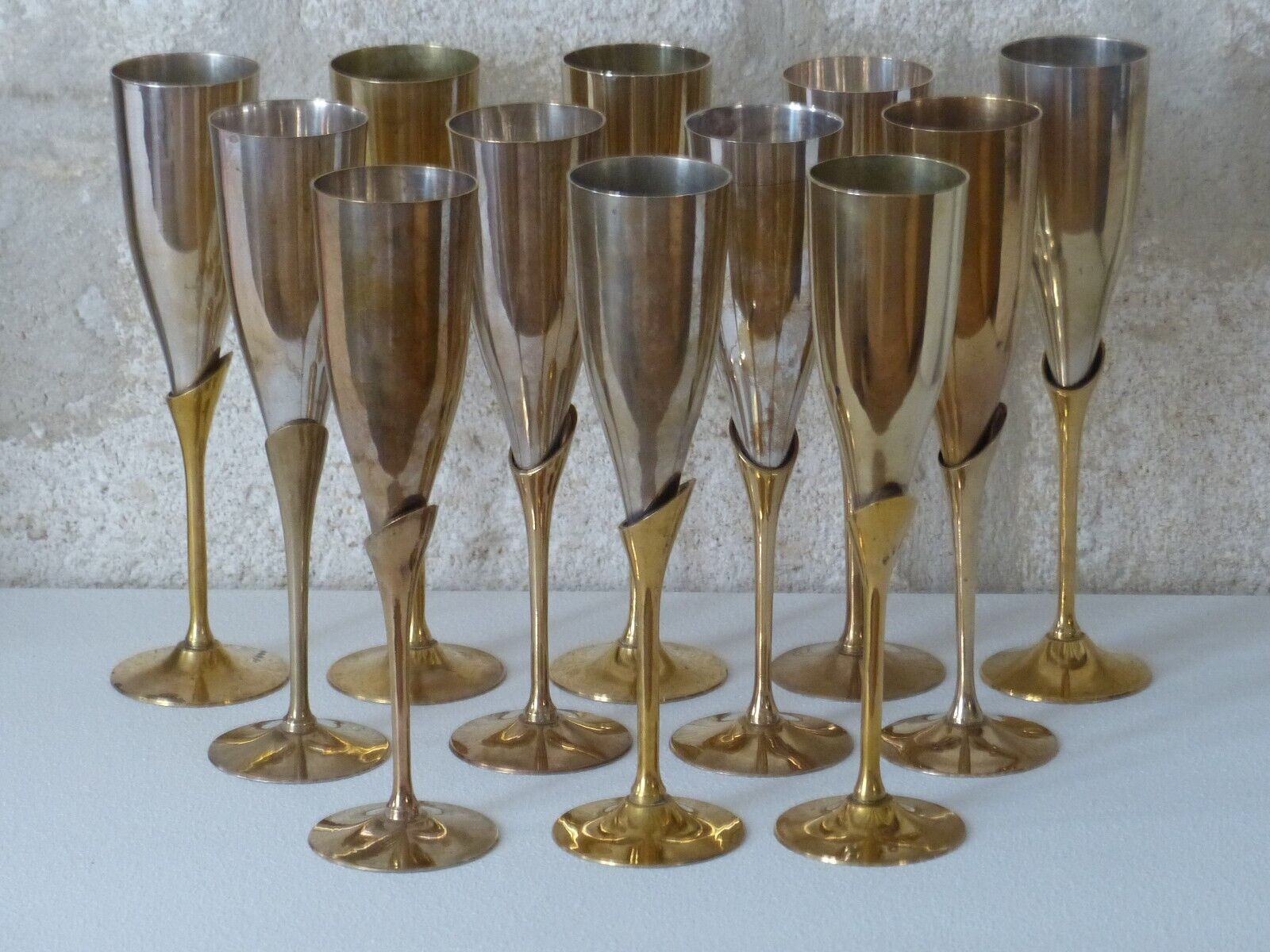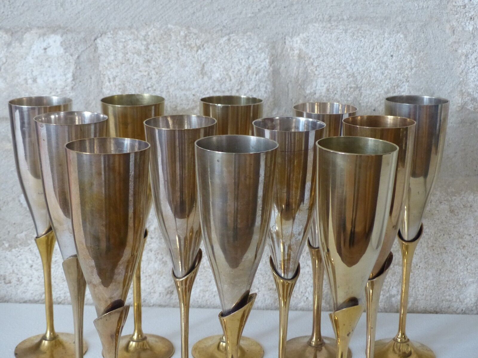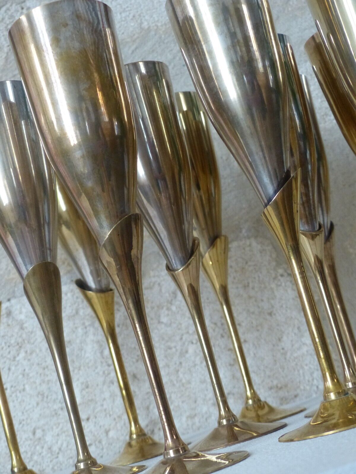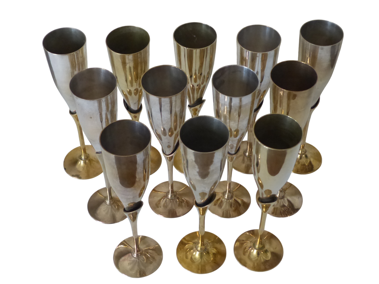 Enhance your barware collection with this charming set of 12x vintage champagne flutes. The flutes are crafted from brass and gilded metal, and feature a silver plated finish. These unique flutes are a perfect addition to any collector's barware collection. The set is not only functional, but also serves as a beautiful display piece. Don't miss out on the opportunity to own this stunning set of vintage champagne flutes! The elegant flute sits in a stem with an assymetric neck. The cups not only add a luxurious touch but also help keep the champagne chilled longer, making them as functional as they are stylish.