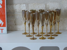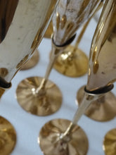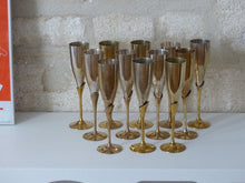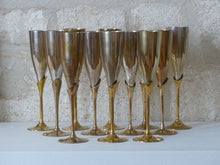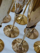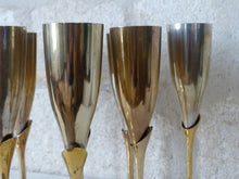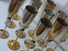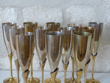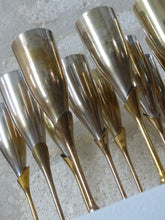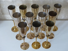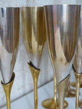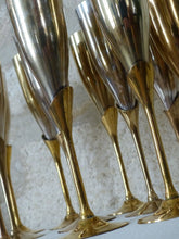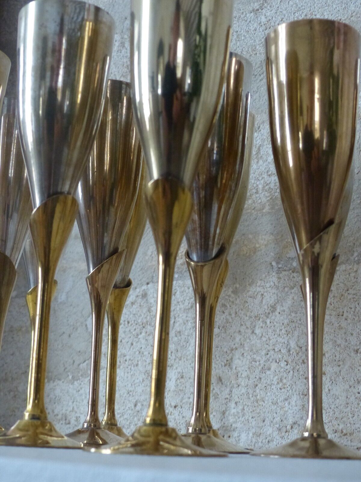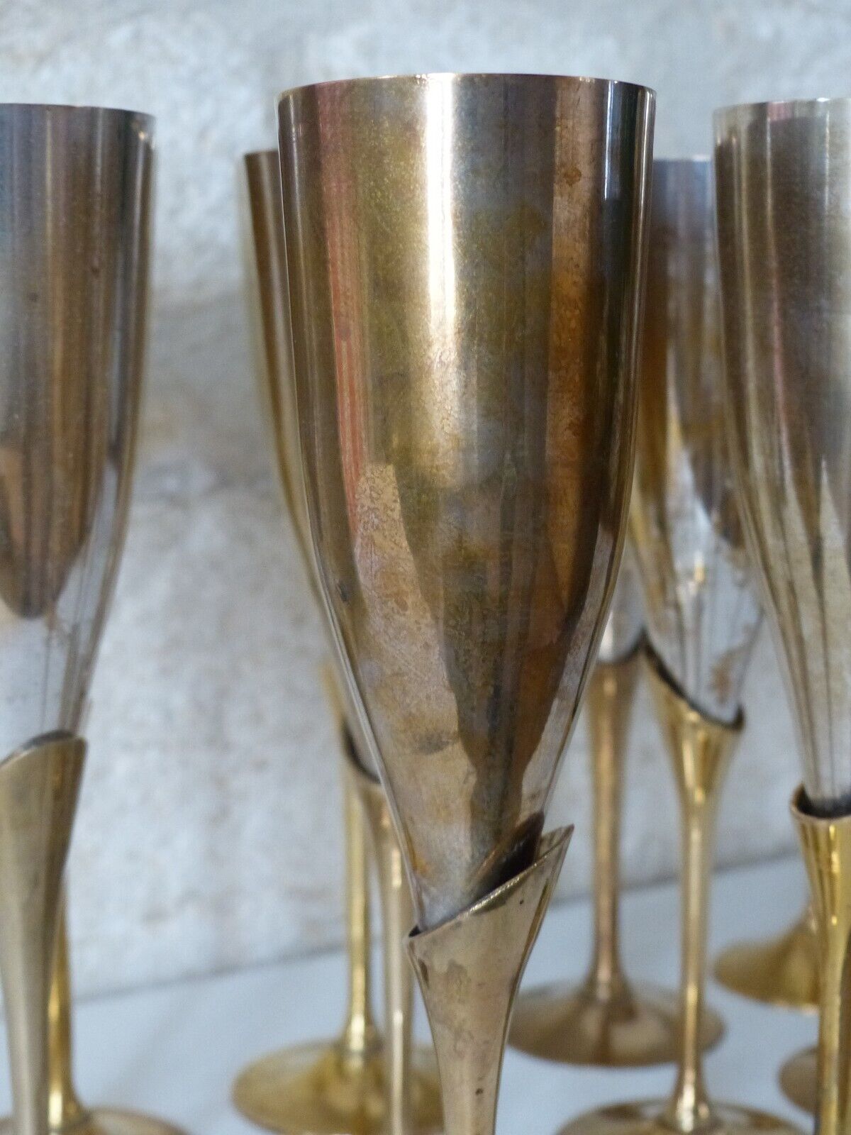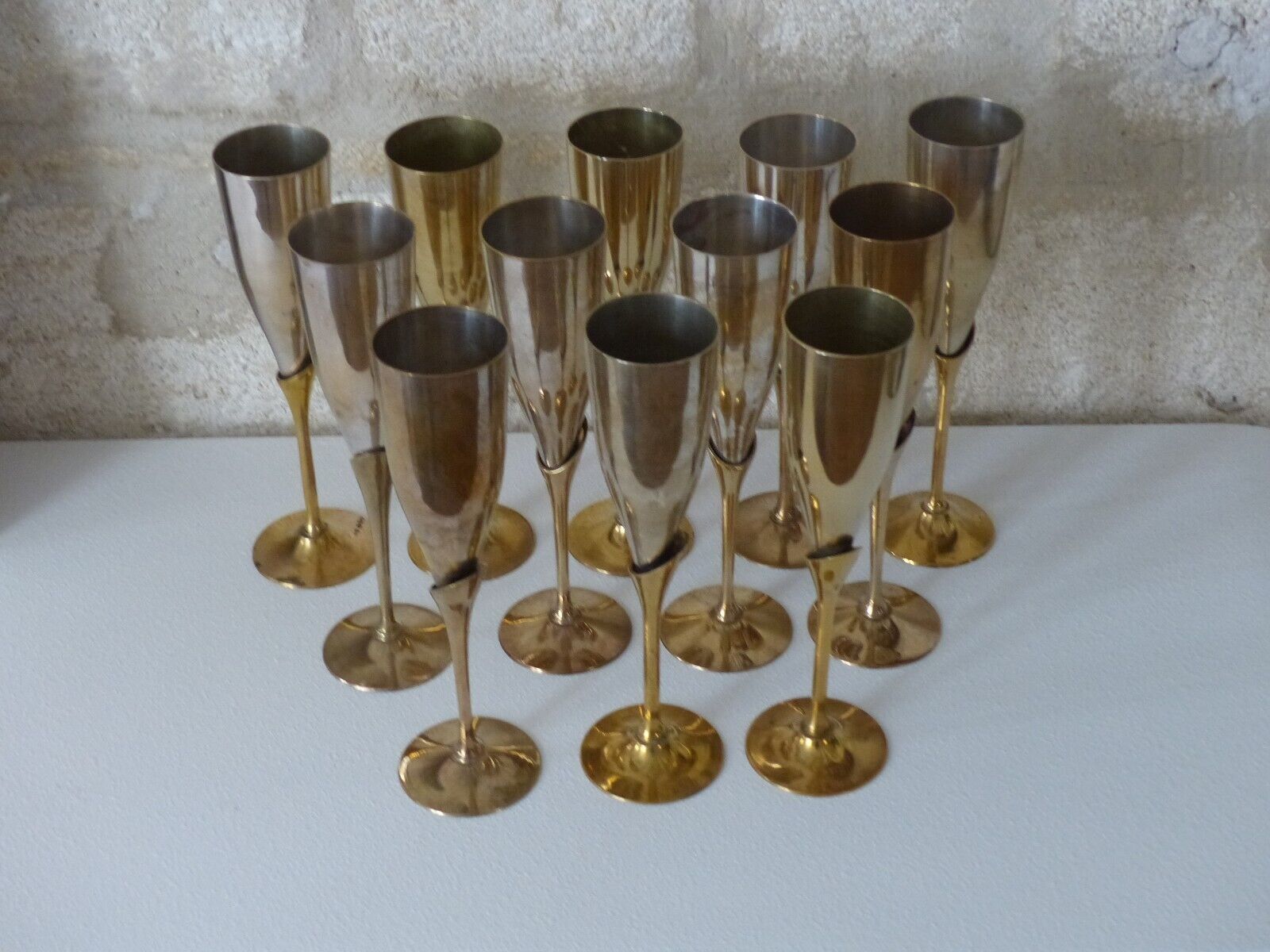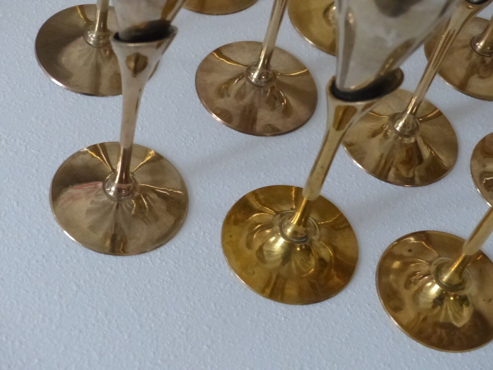 Enhance your barware collection with this charming set of 12x vintage champagne flutes. The flutes are crafted from brass and gilded metal, and feature a silver plated finish. These unique flutes are a perfect addition to any collector's barware collection. The set is not only functional, but also serves as a beautiful display piece. Don't miss out on the opportunity to own this stunning set of vintage champagne flutes! The elegant flute sits in a stem with an assymetric neck. The cups not only add a luxurious touch but also help keep the champagne chilled longer, making them as functional as they are stylish.