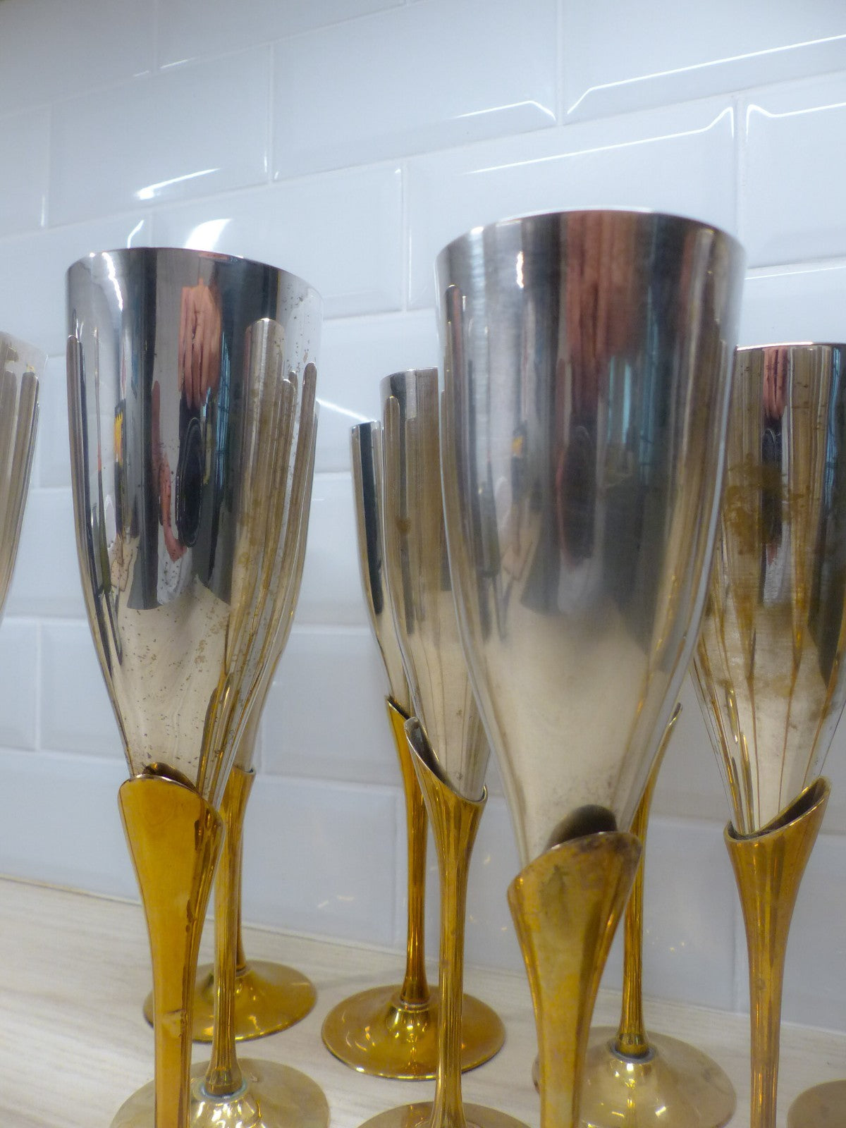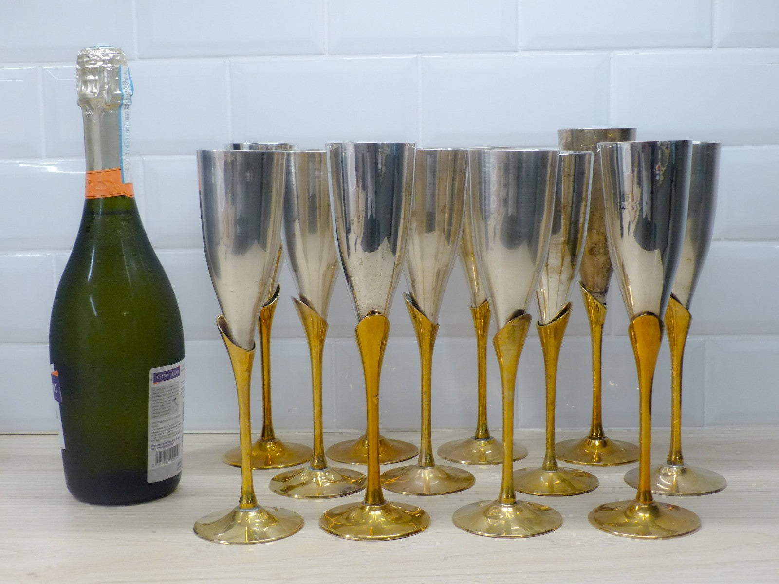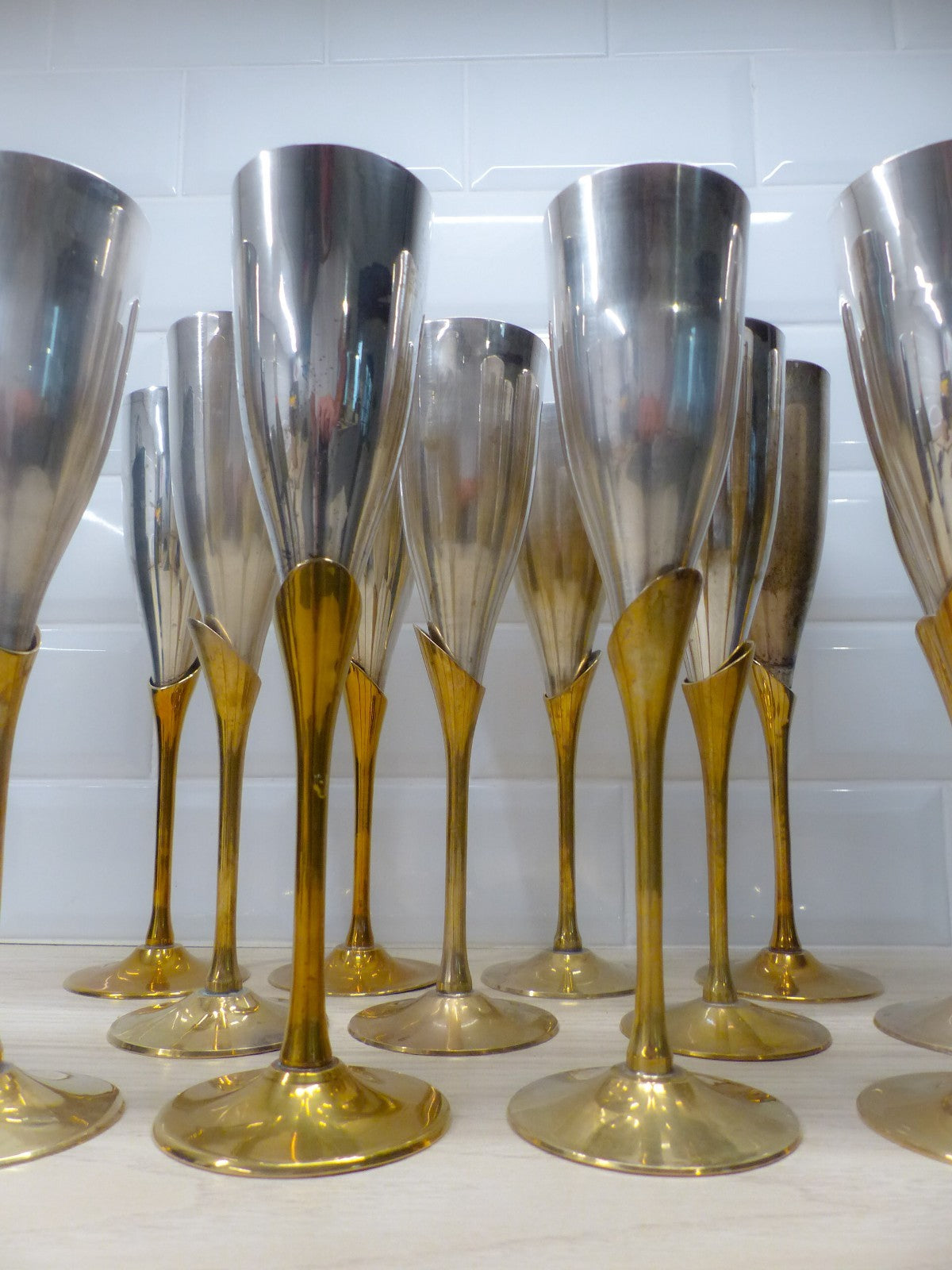 Enhance your barware collection with this charming set of 18x vintage champagne flutes. The flutes are crafted from brass and gilded metal, and feature a silver plated finish. These unique flutes are a perfect addition to any collector's barware collection. The set is not only functional, but also serves as a beautiful display piece. Don't miss out on the opportunity to own this stunning set of vintage champagne flutes! The elegant flute sits in a stem with an assymetric neck. The cups not only add a luxurious touch but also help keep the champagne chilled longer, making them as functional as they are stylish.