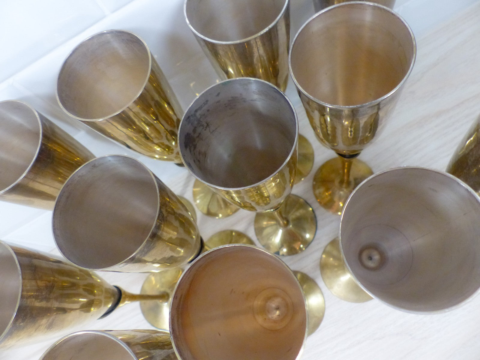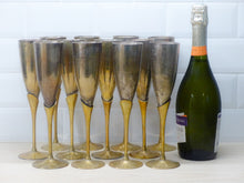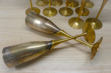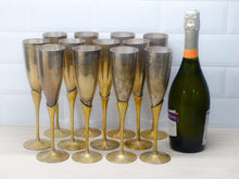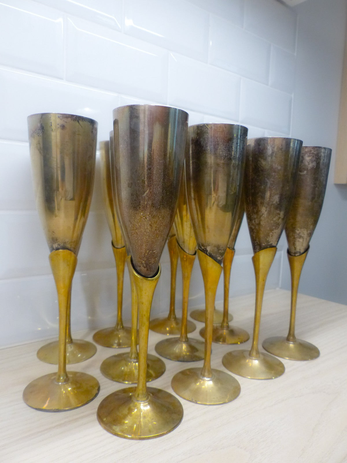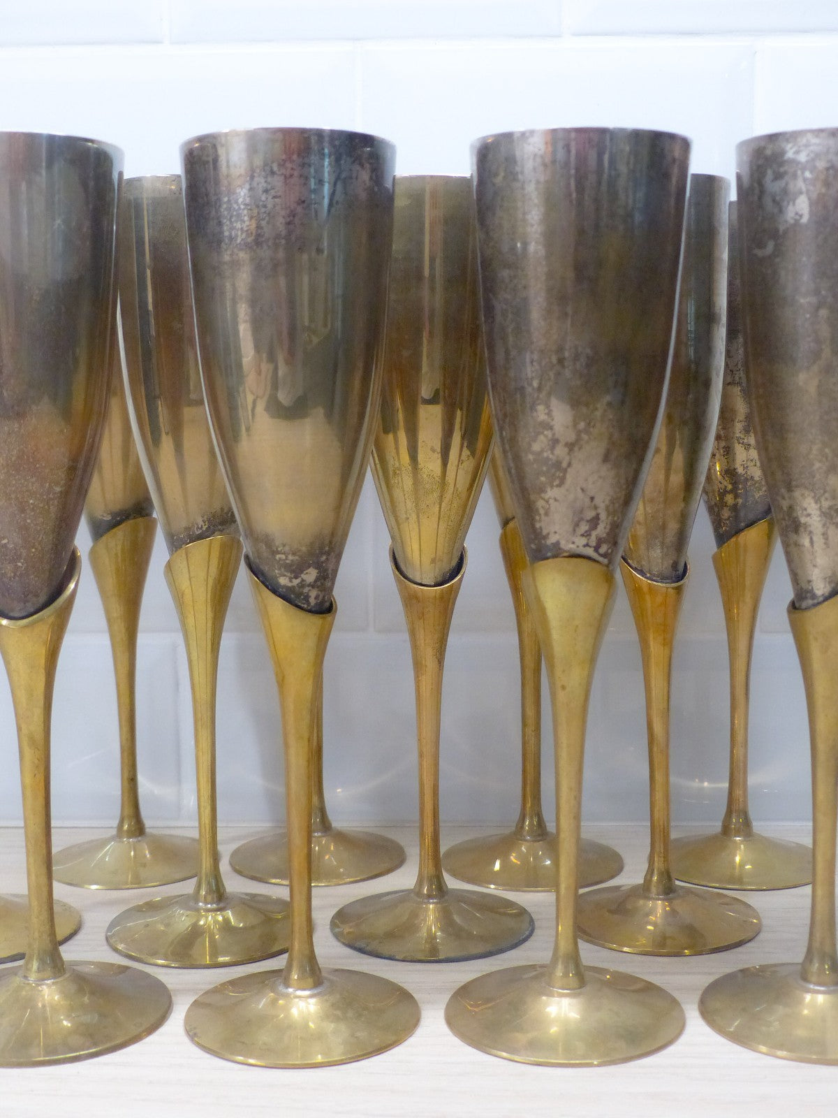 Enhance your barware collection with this charming set of 12x vintage champagne flutes. The flutes are crafted from brass and gilded metal, and feature a silver plated finish. These unique flutes are a perfect addition to any collector's barware collection. The set is not only functional, but also serves as a beautiful display piece. Don't miss out on the opportunity to own this stunning set of vintage champagne flutes! The elegant flute sits in a stem with an assymetric neck. The cups not only add a luxurious touch but also help keep the champagne chilled longer, making them as functional as they are stylish.