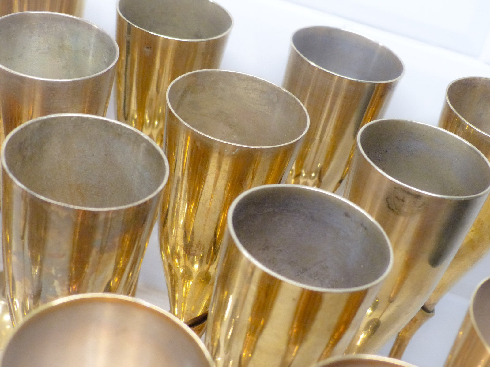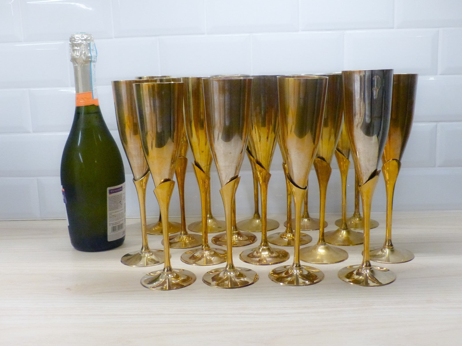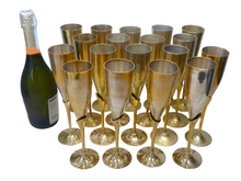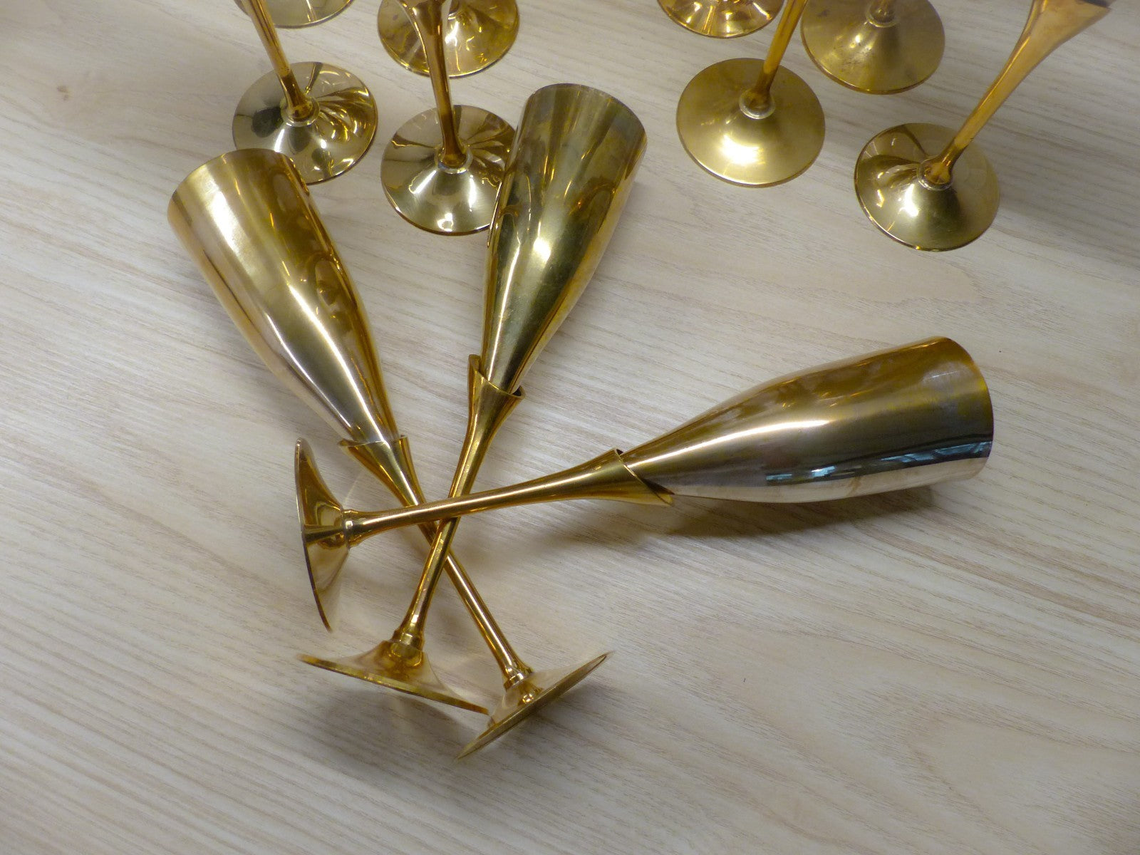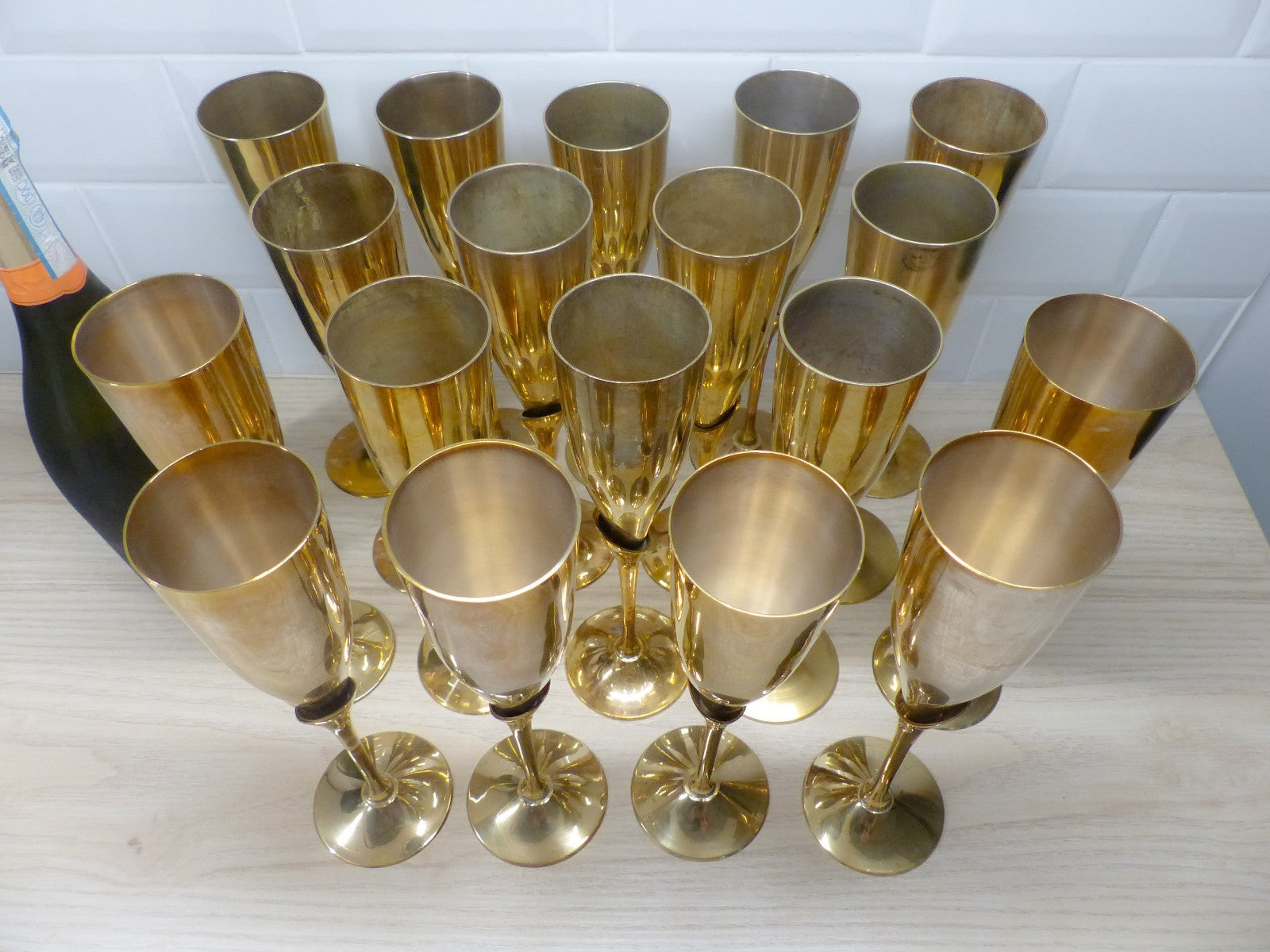 Enhance your barware collection with this charming set of 18x vintage champagne flutes. The flutes are crafted from brass and gilded metal, and feature a silver plated finish. These unique flutes are a perfect addition to any collector's barware collection. The set is not only functional, but also serves as a beautiful display piece. Don't miss out on the opportunity to own this stunning set of vintage champagne flutes! The elegant flute sits in a stem with an assymetric neck. The cups not only add a luxurious touch but also help keep the champagne chilled longer, making them as functional as they are stylish.