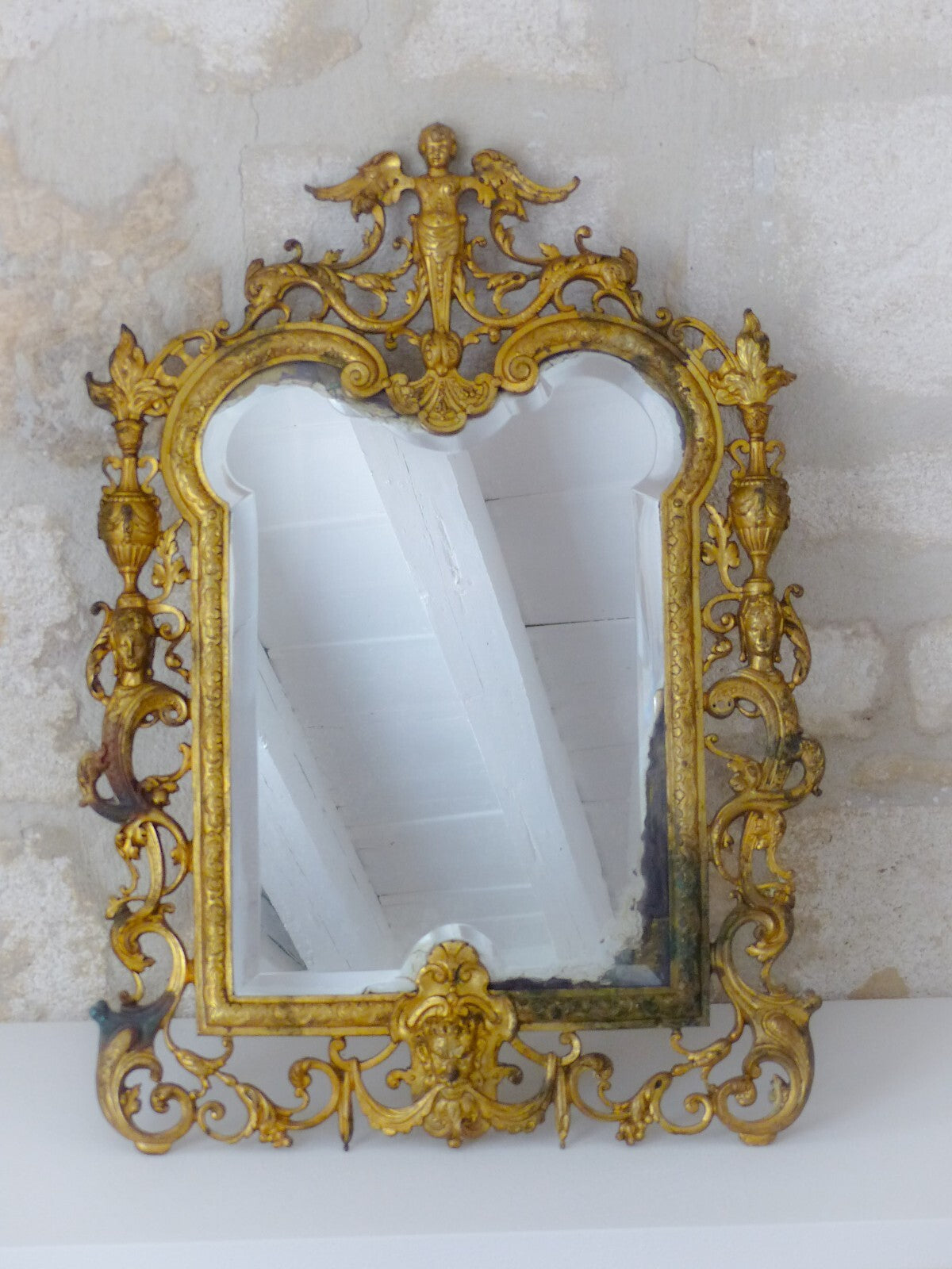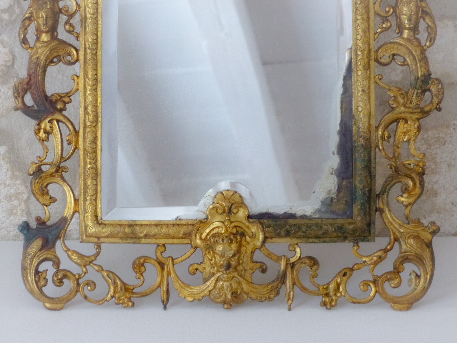 This large gilded bronze mirror is from France, circa 1870, and was made in the style of Louis XIV.