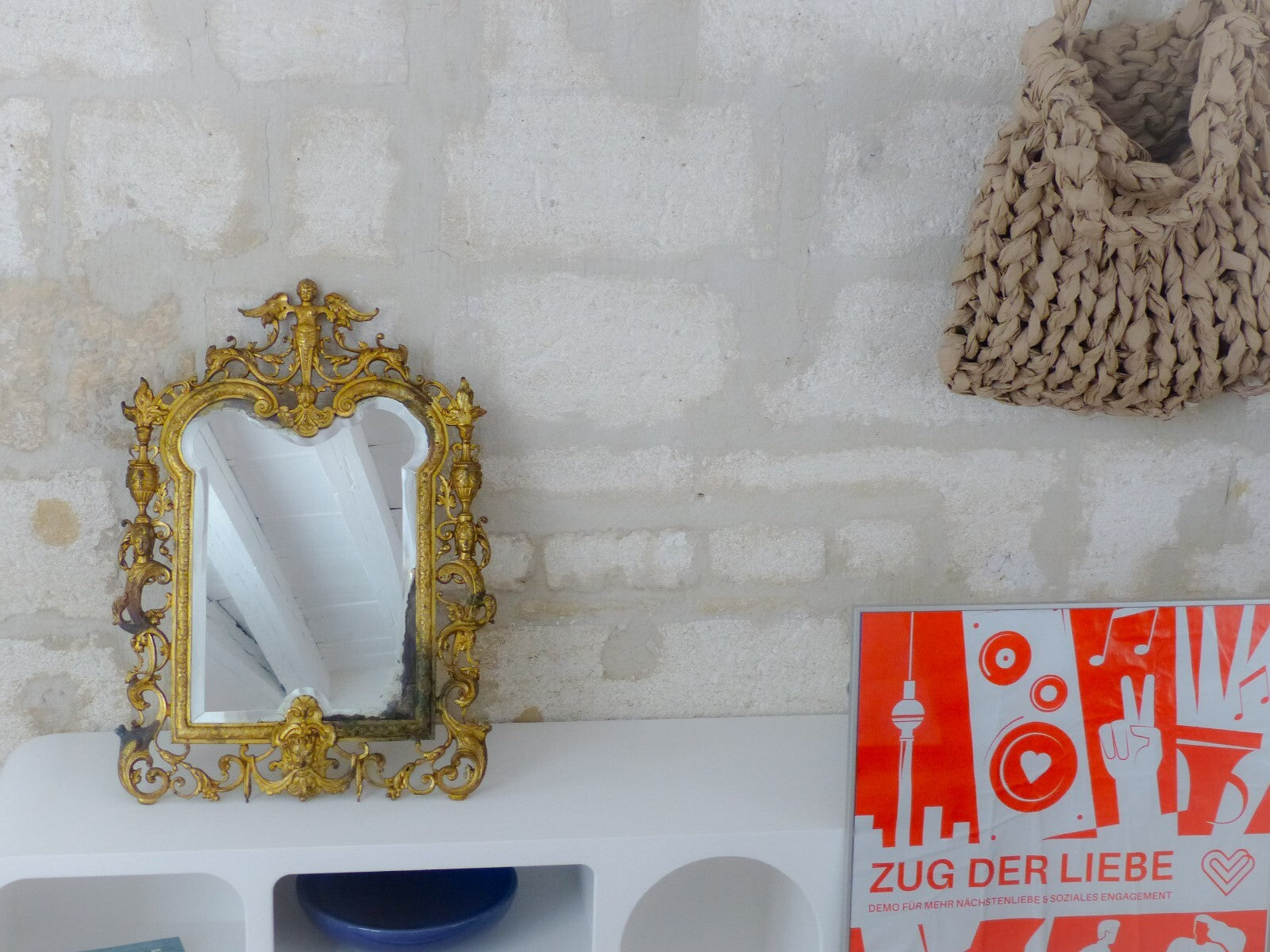 The mirror is in great condition and is surrounded by a molded border. The back side of the glass is secured by an original tin plate that is screwed into the back of the frame.