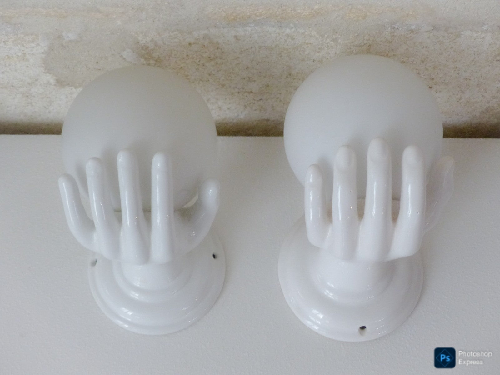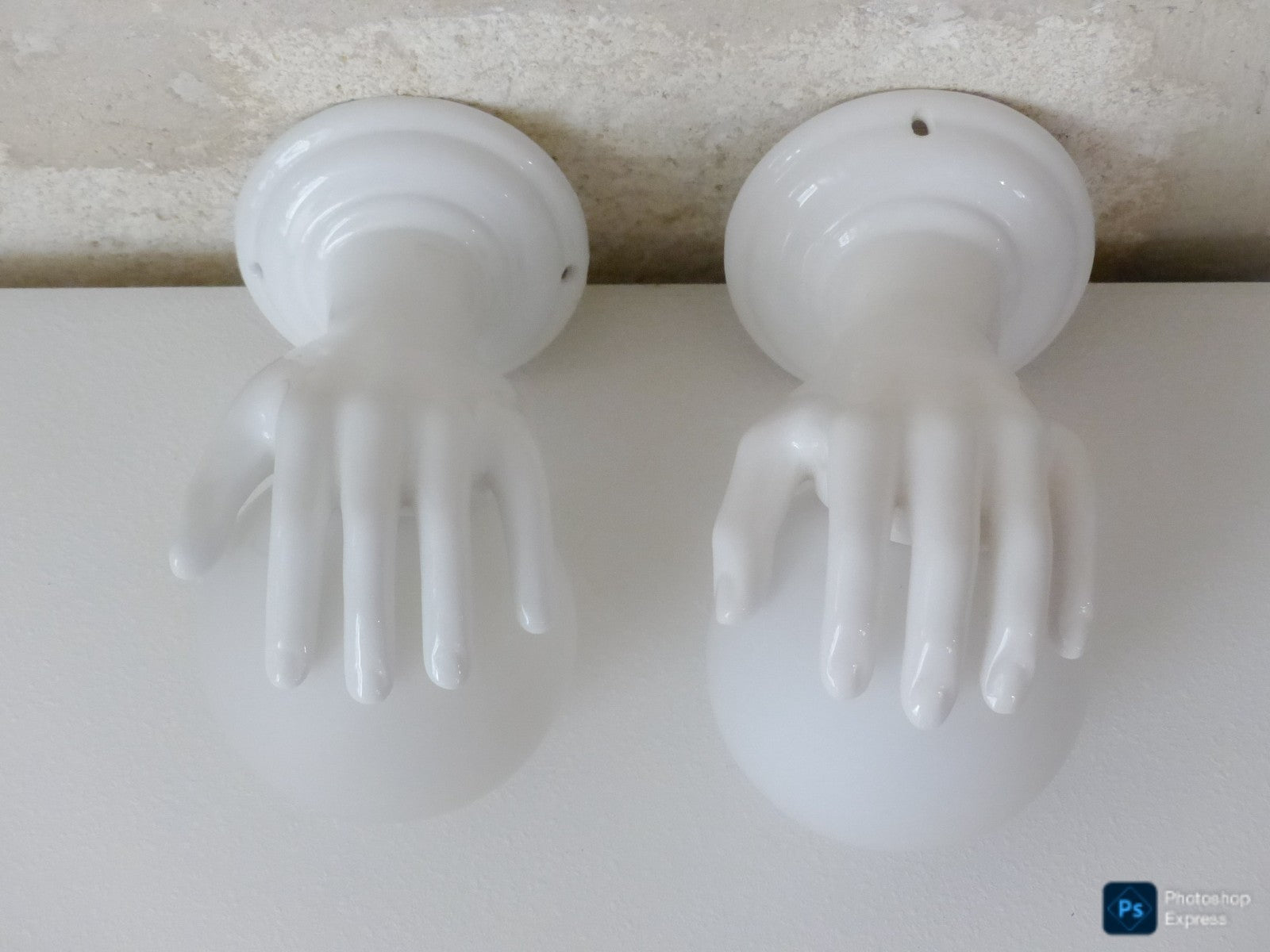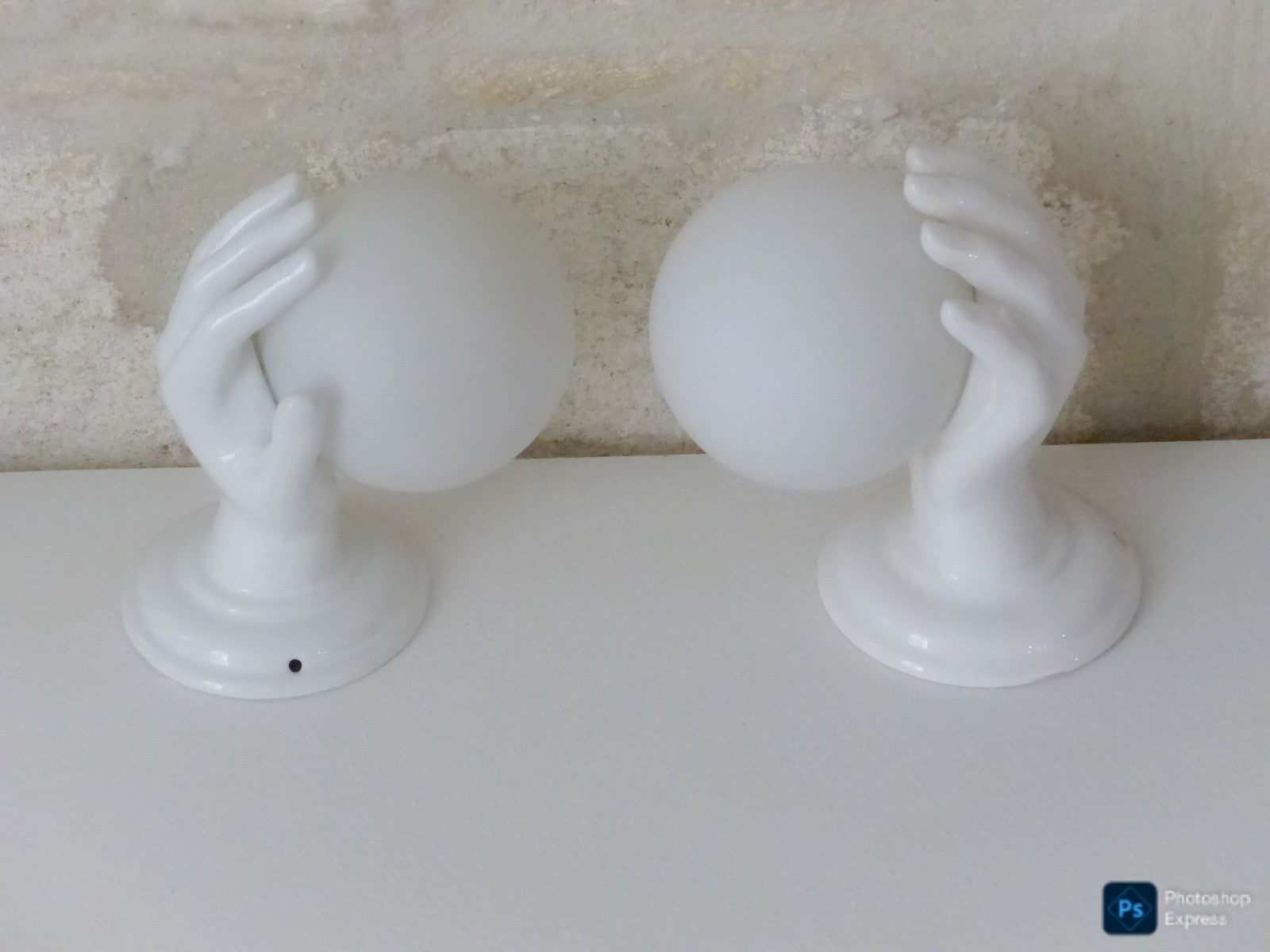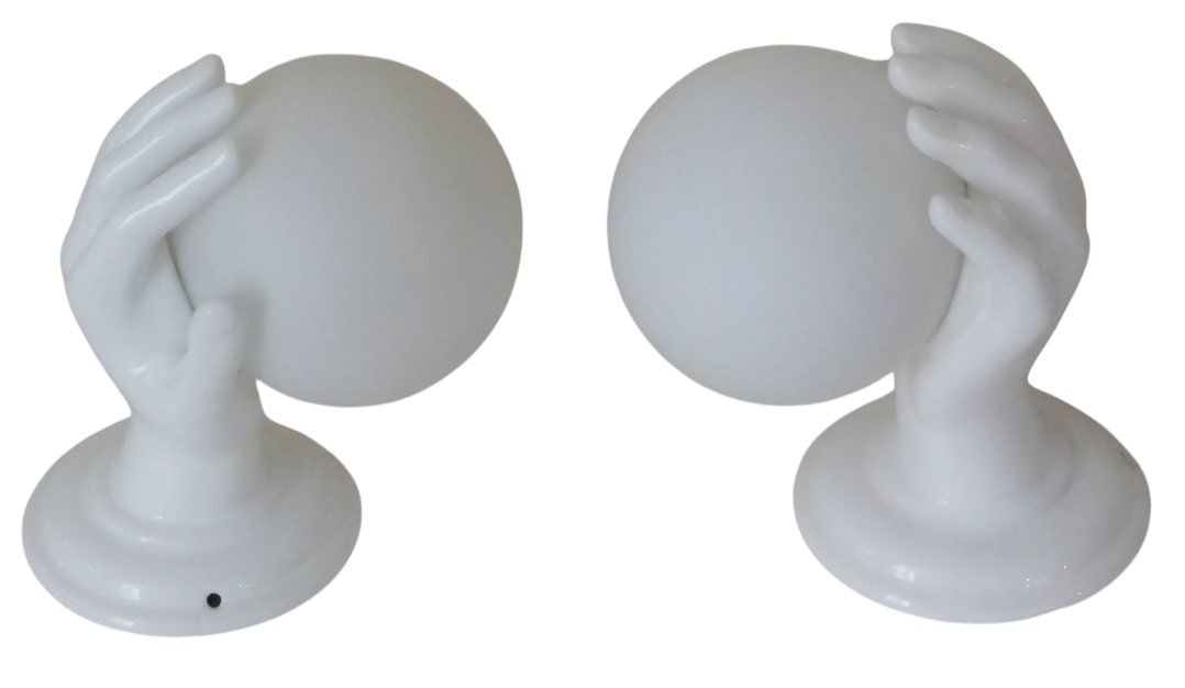 Very elegant set of 2x white ceramic hand sconces with original glass shades,