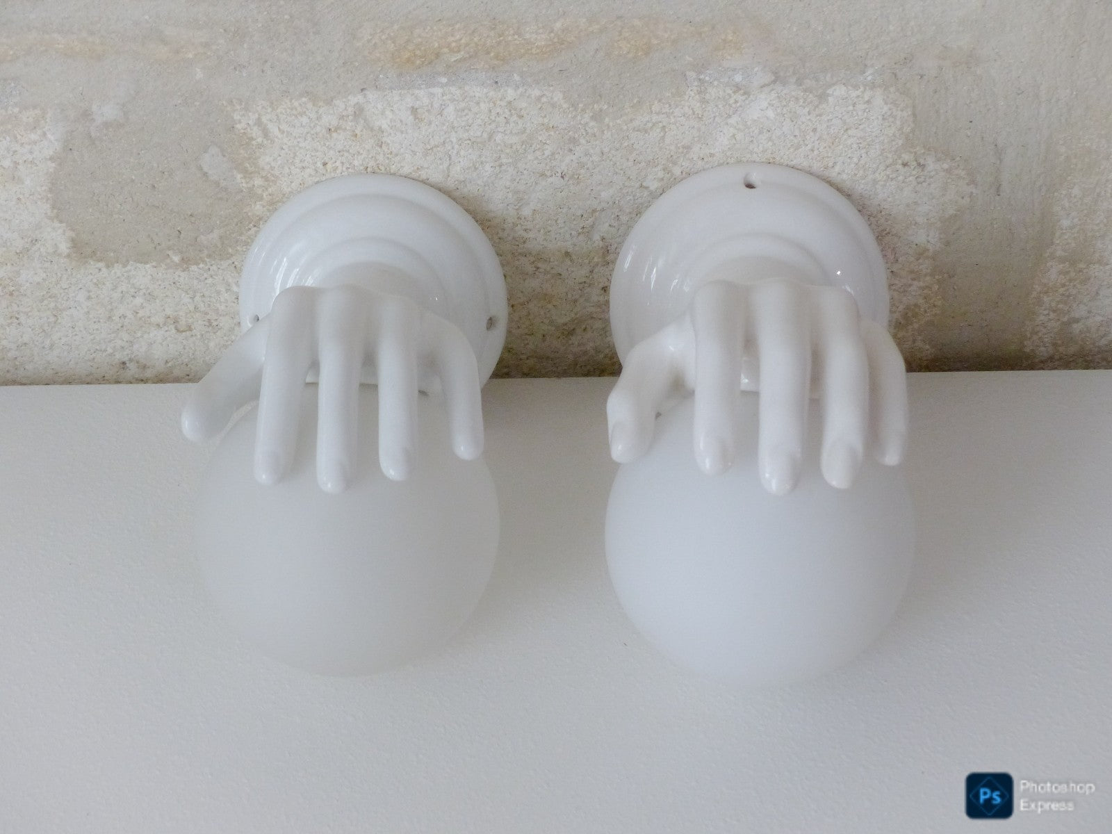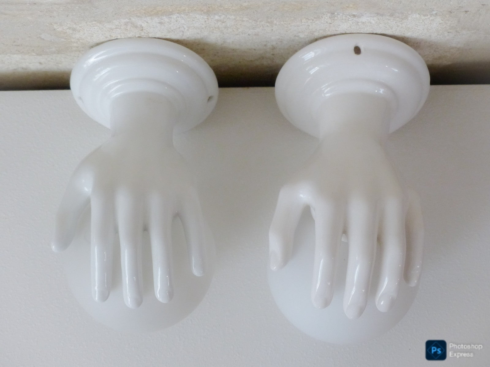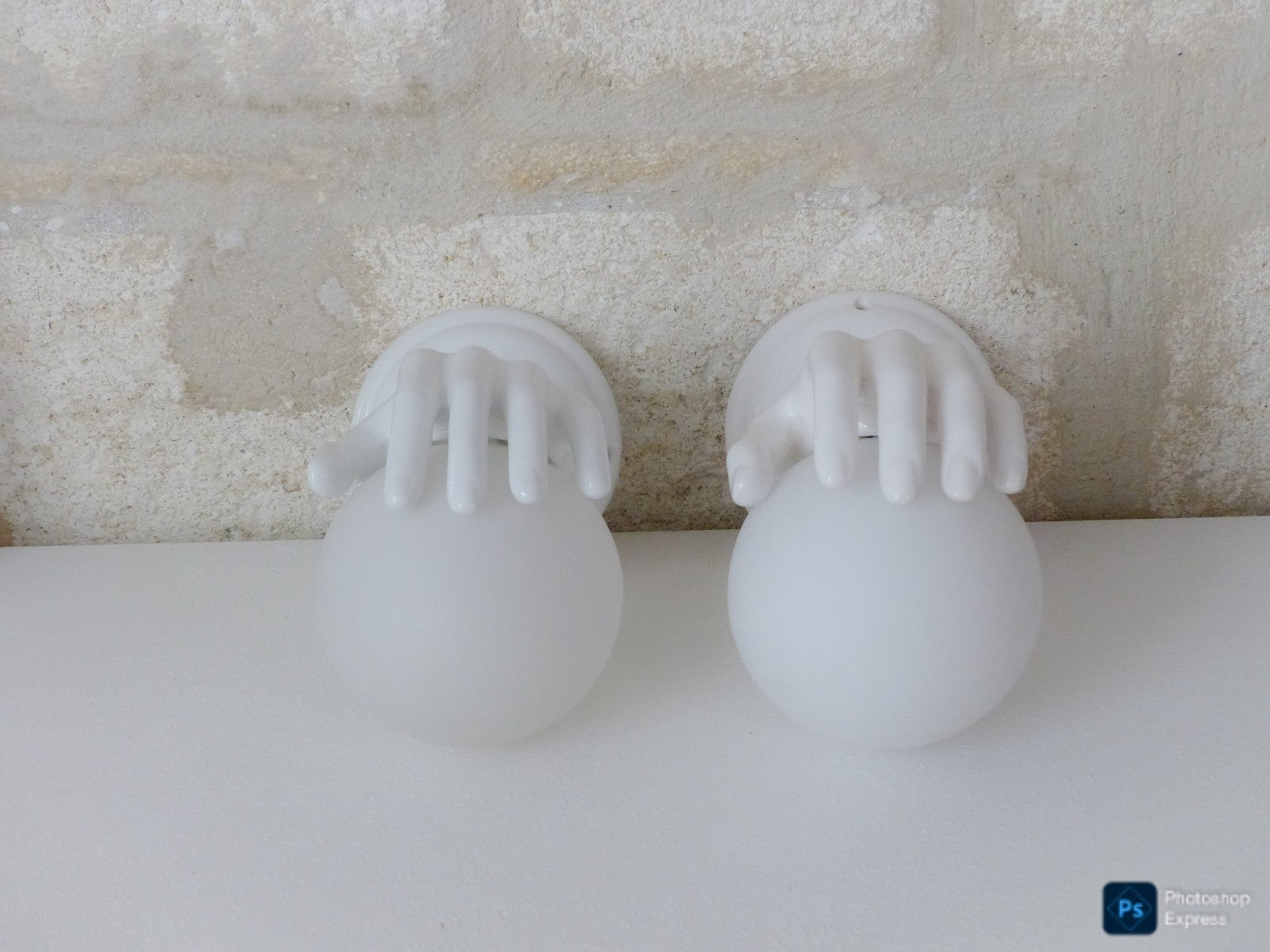 Very elegant set of 2x white ceramic hand sconces with original glass shades,