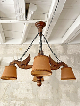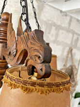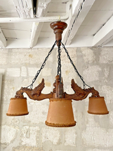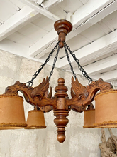 The elegant ceiling light features four impressive winged griffins or gargoyles holding the lamp shades.